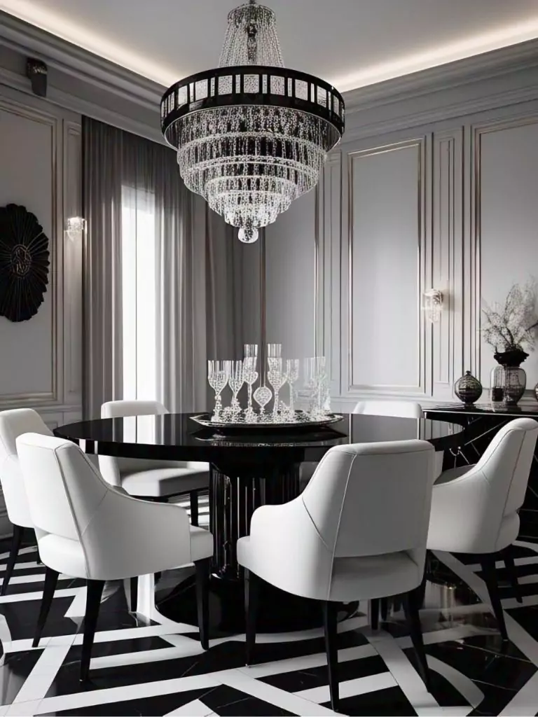 Install a statement chandelier preferably in black or crystal to cast a warm, glamorous glow over the dining area. Incorporate geometric patterns, such as a black and white tiled floor or an Art Deco-inspired rug, to tie the look together. This style is perfect for those who love bold, luxurious designs that evoke the elegance of the 1920s while remaining timeless.