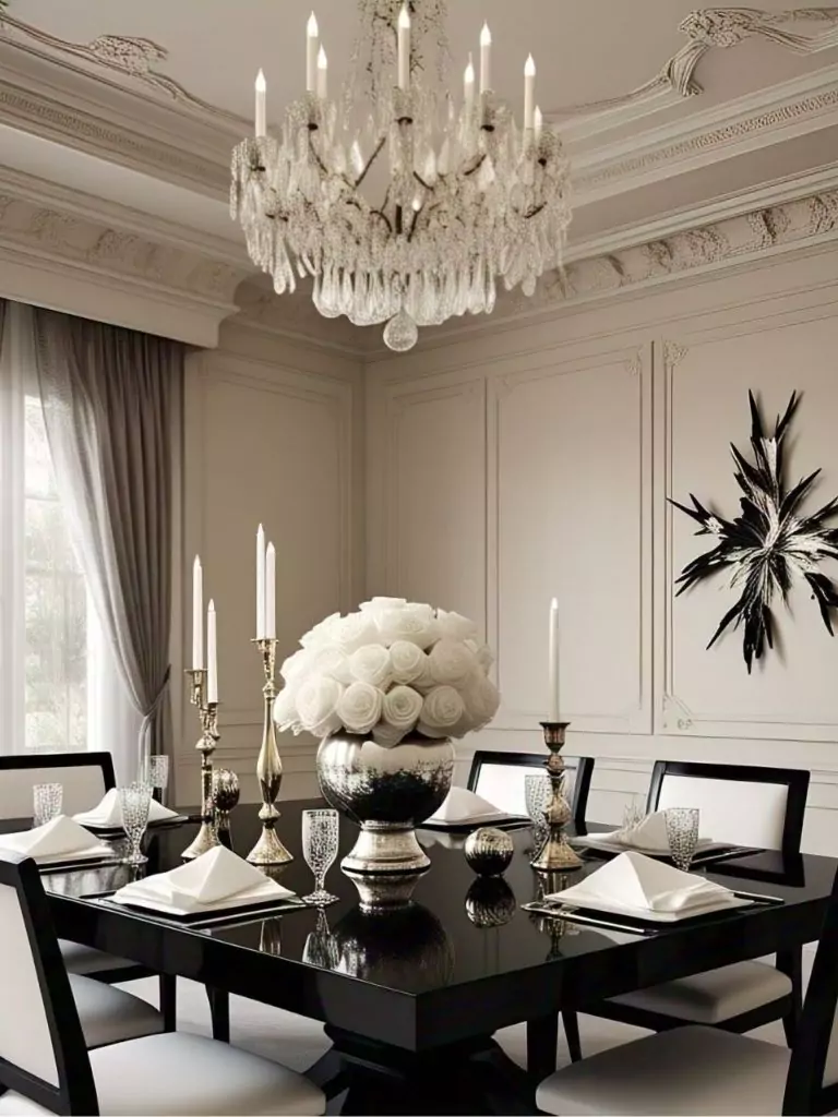 For a dining room that exudes old-world glamour, embrace the Art Deco style with a black dining table as the centerpiece. Choose a table with sleek, polished lines and pair it with luxurious white velvet upholstered chairs for a touch of decadence. A mirrored tray as a centerpiece, adorned with crystal glassware or a small sculpture, adds a reflective quality that enhances the opulent vibe.