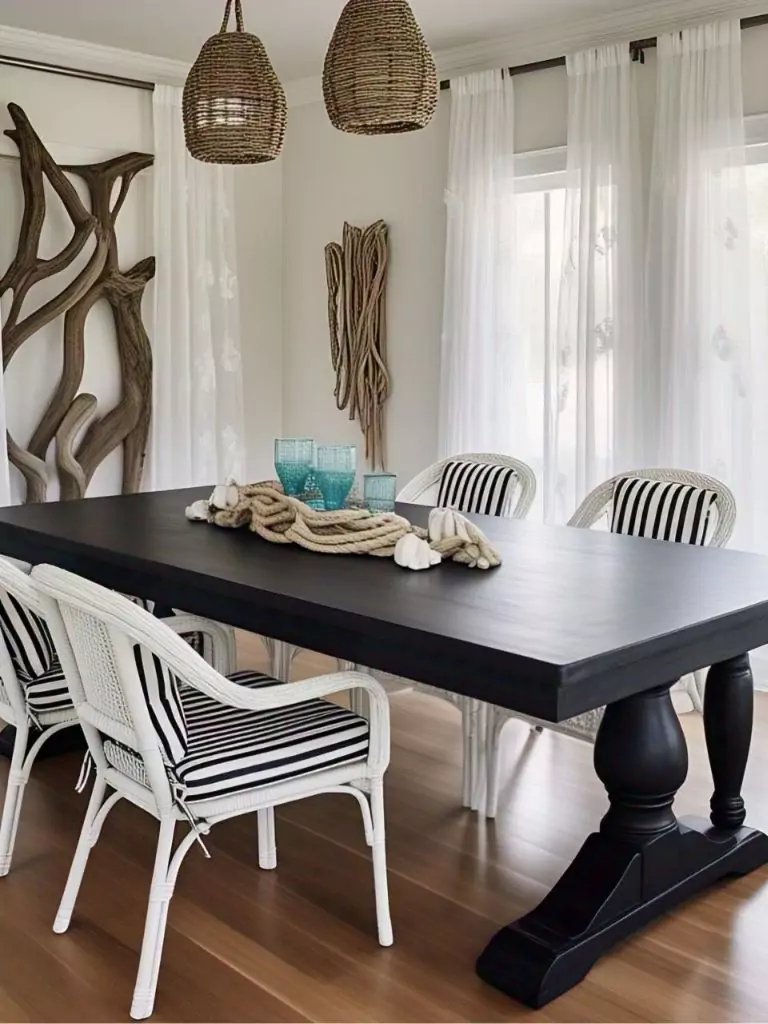 White sheer curtains allow natural light to flood the space, enhancing the airy feel, while small blue accents like napkins or glassware tie in the coastal theme without straying from the black and white palette. For black dining table décor, incorporate driftwood, seashells, or a white coral sculpture to complete the look. This style is perfect for creating a relaxed, vacation-inspired dining experience.