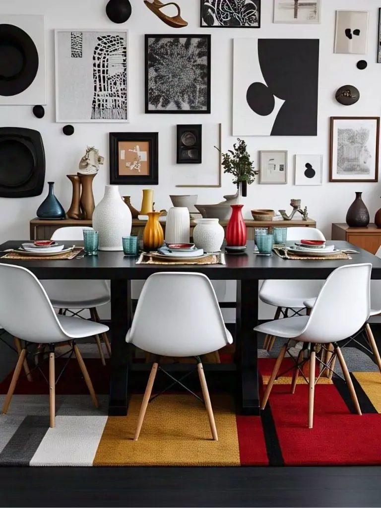 Add a vibrant rug in a bold color, like red or mustard, to inject energy into the space while keeping the black and white theme cohesive. Use black dining table decor ideas like a mix of white ceramic vases, colorful candles, or unique tableware to enhance the eclectic vibe. This design is ideal for those who love to blend styles and create a dining room that feels uniquely personal.