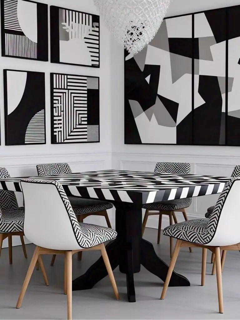 Inject personality into your dining room with bold black and white patterns that make a statement. A black dining table serves as the perfect anchor for a graphic tablecloth featuring chevron, herringbone, or geometric designs in black and white. Pair this with white chairs adorned with patterned cushions to add visual interest without overwhelming the space.