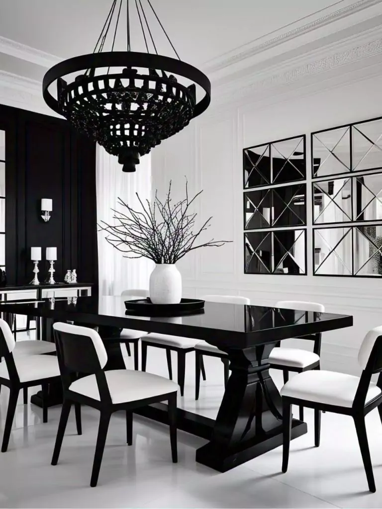 For a bold, dramatic dining room, embrace a high-contrast black and white palette that commands attention. Start with a black dining table set against a stark white backdrop, such as white walls and flooring.