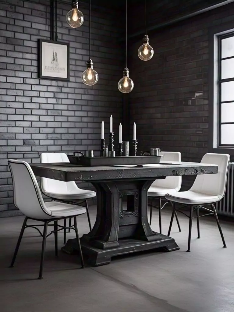 Exposed brick walls or concrete floors enhance the raw, industrial aesthetic, while Edison bulb pendant lights add a trendy, vintage touch. Incorporate black dining table decor like a metal tray with white candles or industrial-style glassware to maintain the theme. This look is perfect for urban lofts or homes aiming for a modern, slightly rugged aesthetic that feels effortlessly cool.