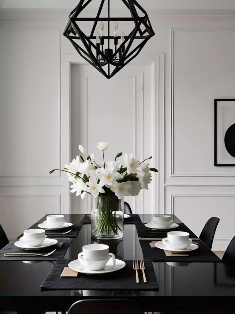 For those who crave simplicity without sacrificing style, a minimalist black and white dining room is the perfect choice. Start with a sleek black dining table with clean lines, paired with crisp white walls to create a bright, airy atmosphere.