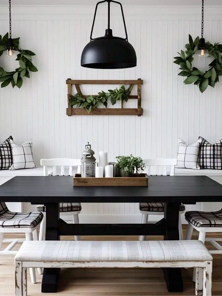 The modern farmhouse aesthetic combines rustic warmth with clean, contemporary lines, making it a perfect fit for a black and white dining room. Center the space with a black dining table and pair it with white beadboard paneling or shiplap walls for a cozy, farmhouse-inspired backdrop.