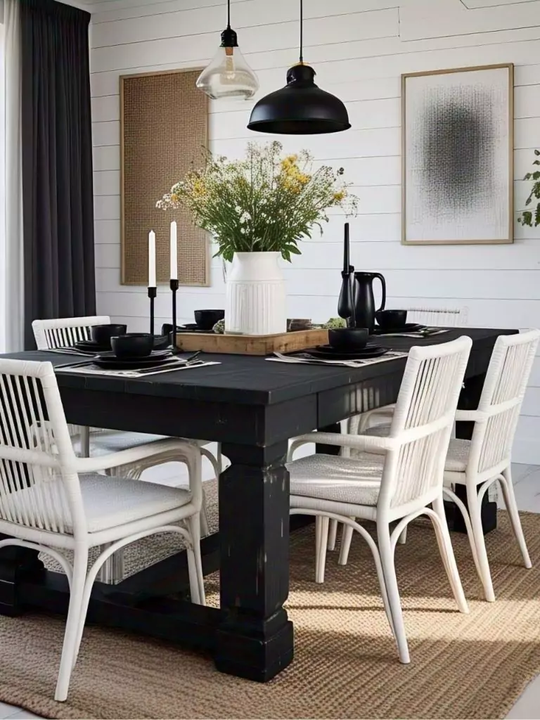 This classic color palette creates a striking contrast that can adapt to any aesthetic, from sleek modernism to cozy farmhouse charm. Anchoring your dining space with a black dining table or black kitchen table instantly elevates the room, providing a bold focal point that pairs beautifully with white accents.