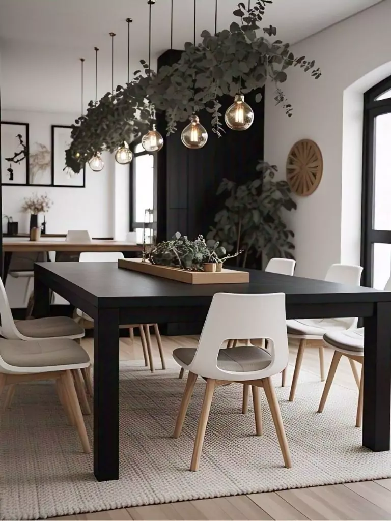 Scandinavian design is all about functionality, simplicity, and coziness, making it an excellent choice for a black and white dining room. Center the space with a matte black dining room table paired with white wooden chairs featuring clean, minimalist lines.
