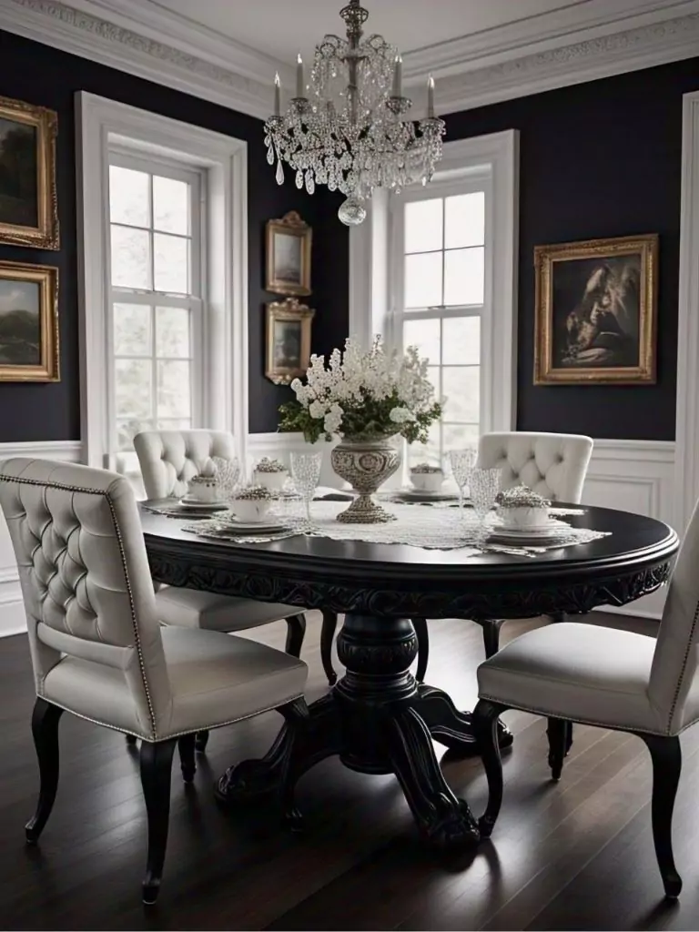For a dining room that exudes classic sophistication, opt for a traditional black and white design. A black dining table with ornate details, such as carved legs or a polished finish, pairs beautifully with white upholstered chairs featuring tufted backs.