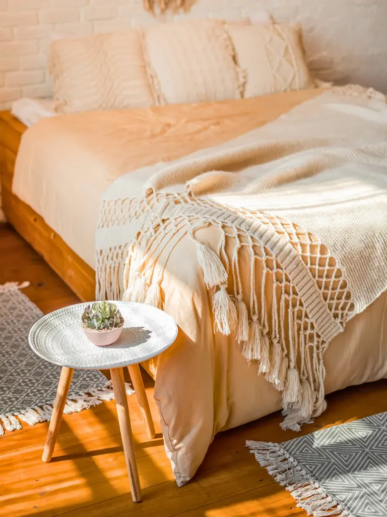 Incorporating natural materials into your Boho bedroom is key to creating that earthy, grounded vibe. Wood, rattan, linen, cotton, and jute all work wonderfully.