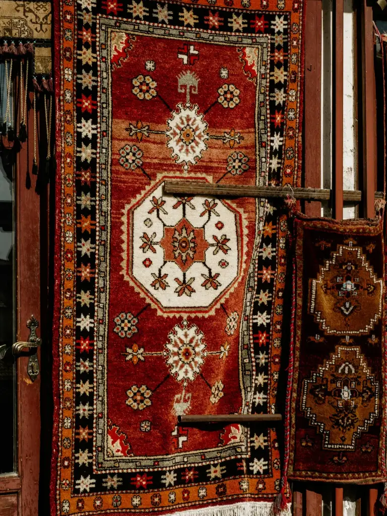 Think Moroccan-style rugs or Persian-inspired patterns with vibrant reds, deep blues, and earthy tones.