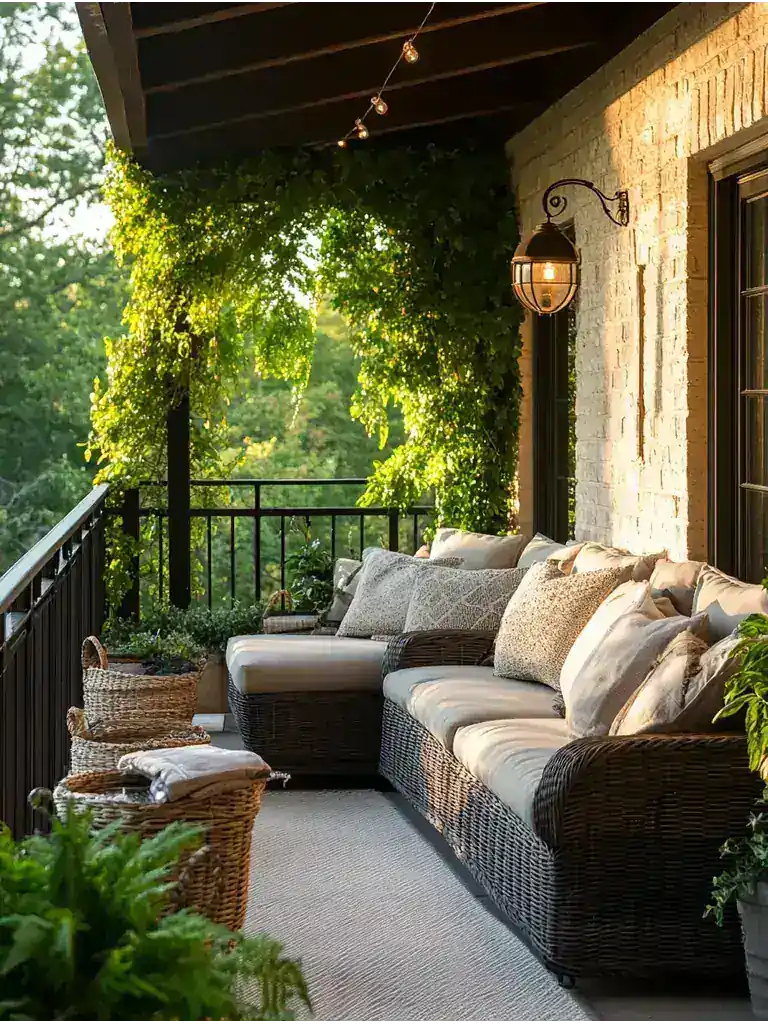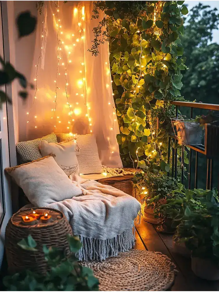 Layering textiles creates a warm and inviting atmosphere, but incorporating greenery takes your balcony comfort to the next level.
