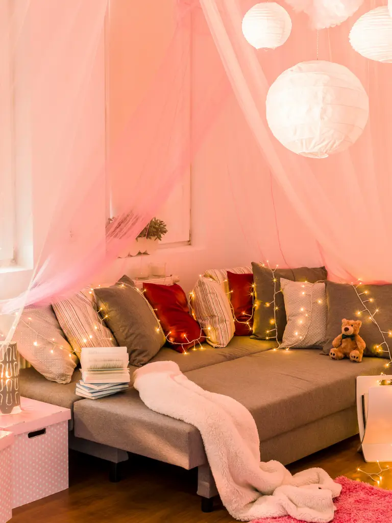 Drape fairy lights above your bed or around your window frame for a cozy, dreamy glow.