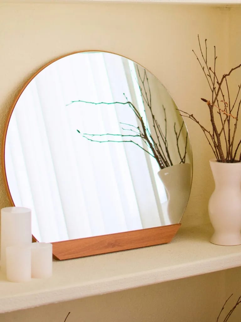 A small round mirror on my shelf made my tiny living room feel bigger and brighter.