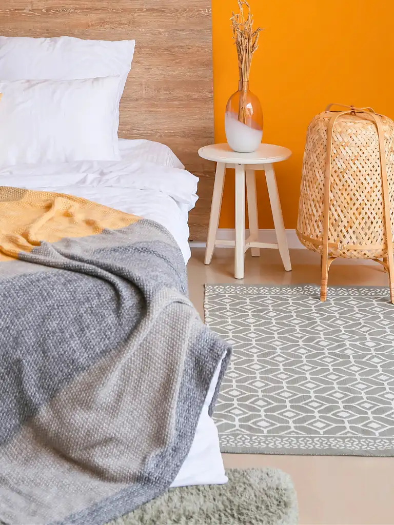 Rugs also help define the bed area especially useful in large rooms or rentals with basic flooring.