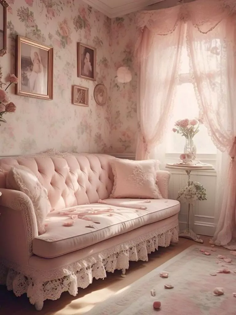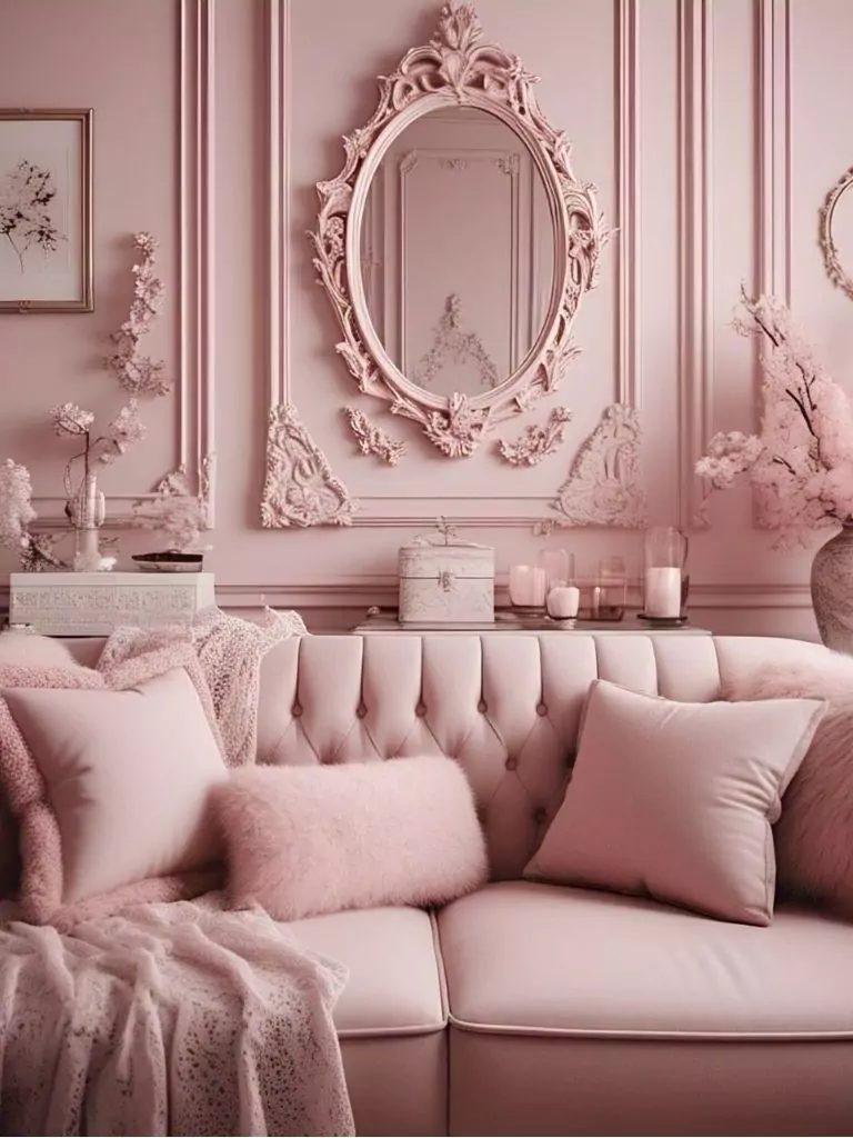 Floral patterns are a classic way to enhance the feminine charm of a pink couch. Whether it’s through wallpaper, cushions, or a floral armchair, these patterns create a romantic, delicate look.