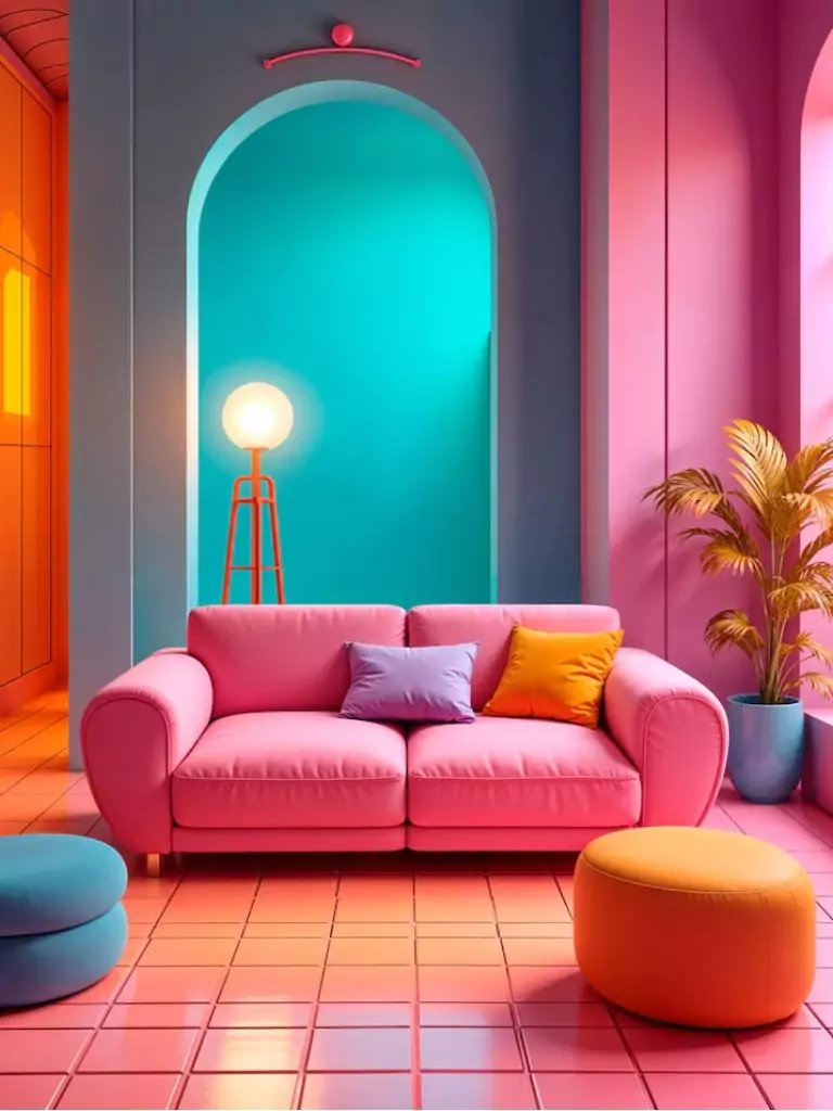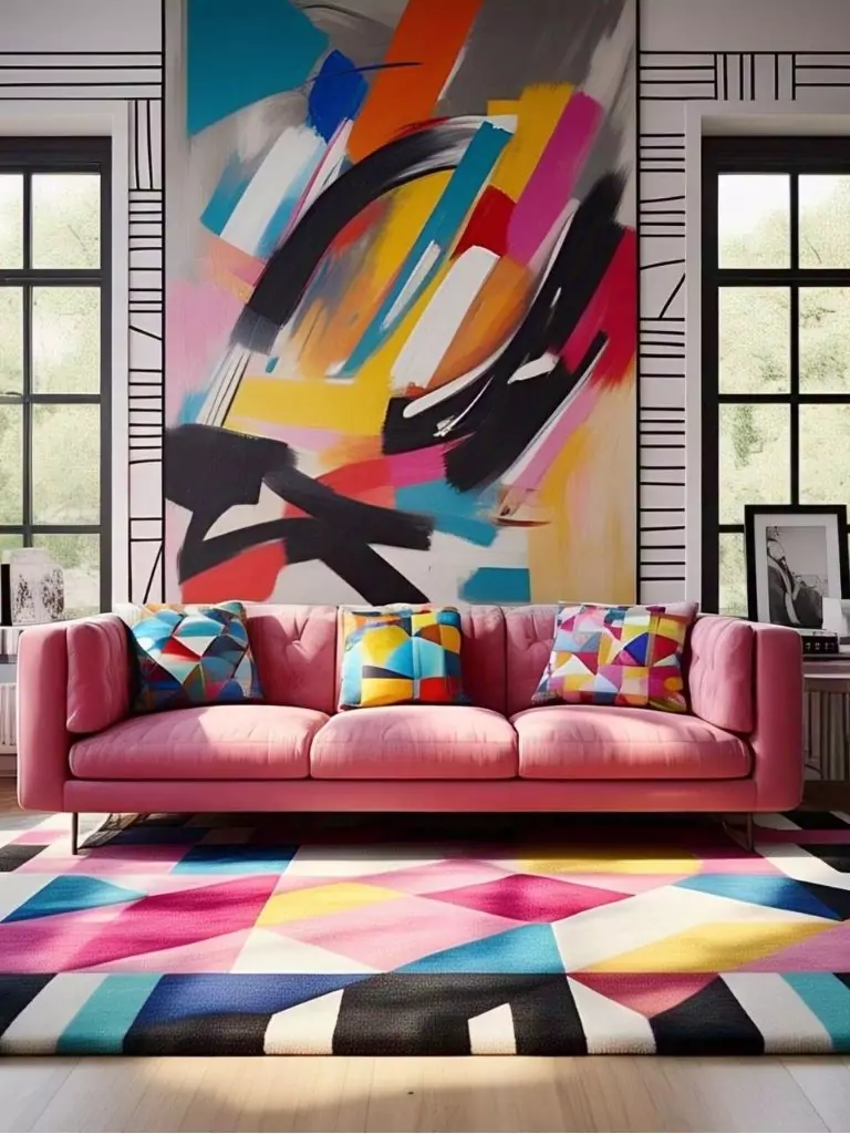 Geometric decor adds structure and modernity, which pairs perfectly with the softness of a pink sofa. This style works especially well in small city apartments where you want every design choice to feel impactful and fun.