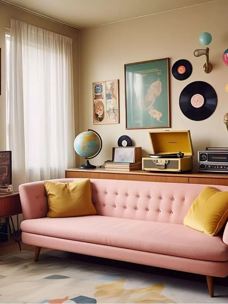 10. Retro Revival: Pink Couch in a Mid-Century Setting
