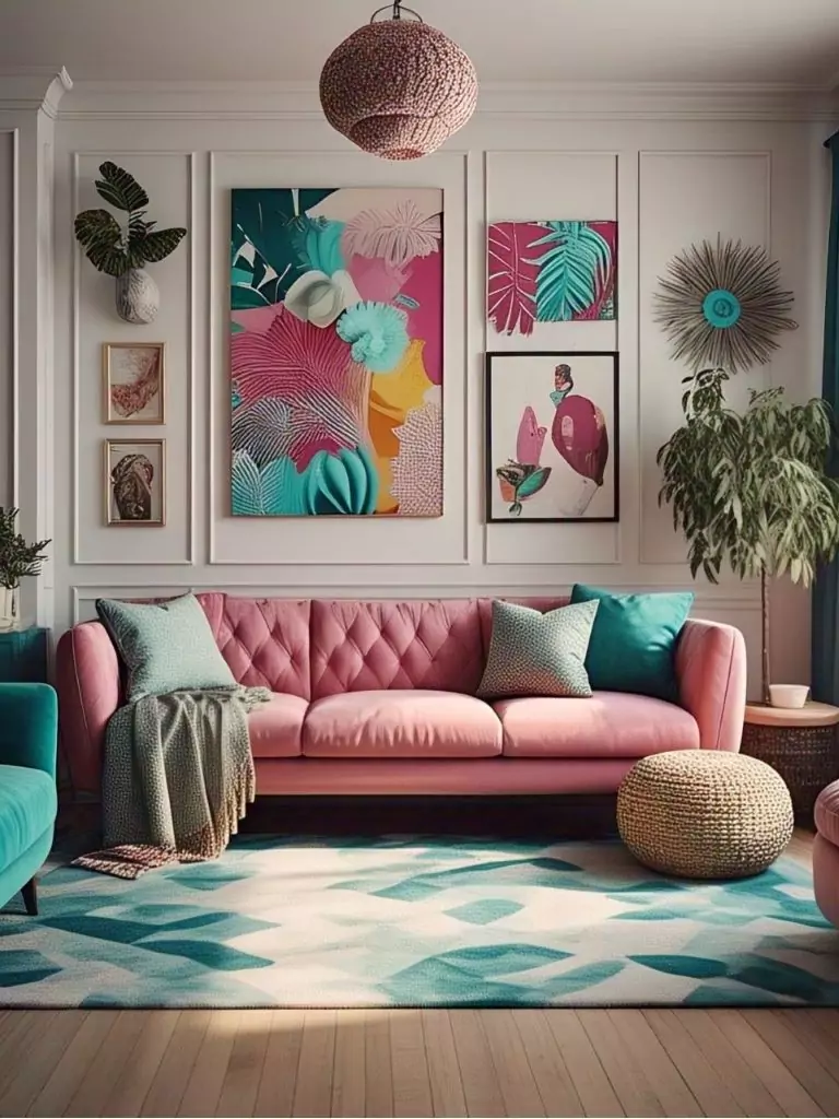 Inject energy into your living room by combining your pink couch with bold geometric patterns. A patterned area rug, graphic throw pillows, or abstract wall art can create a vibrant, contemporary space.