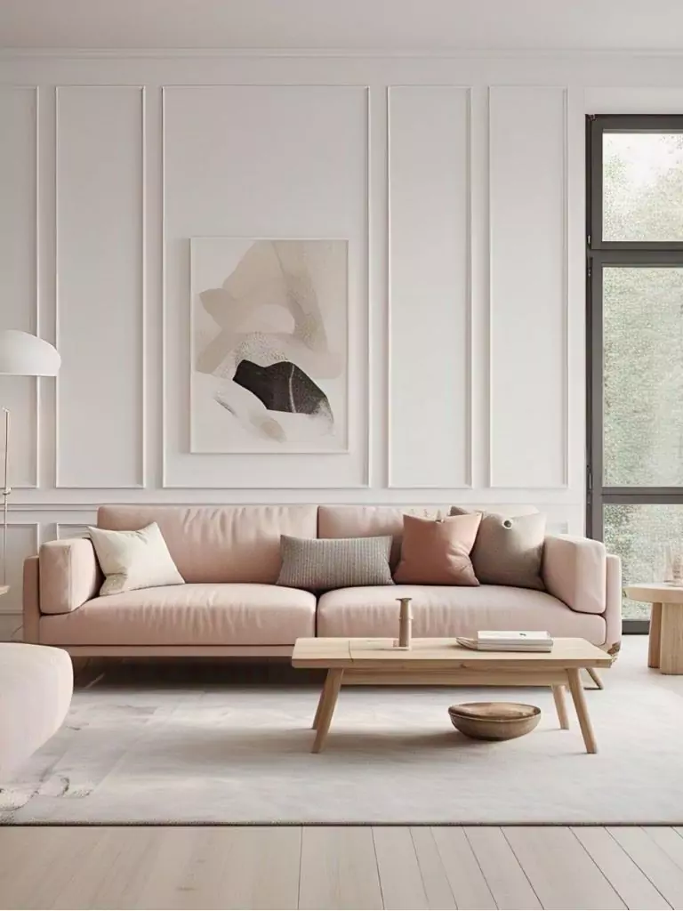 9. Scandinavian Serenity: Pink Couch with Minimalist Wood Tones