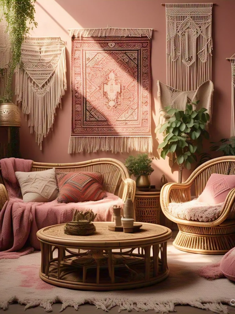 Create a relaxed and eclectic atmosphere by blending pink tones with bohemian elements. Keep the walls a neutral white to allow pink accents to stand out. Layer Moroccan-inspired rugs in pink and orange hues to add vibrancy and pattern.
