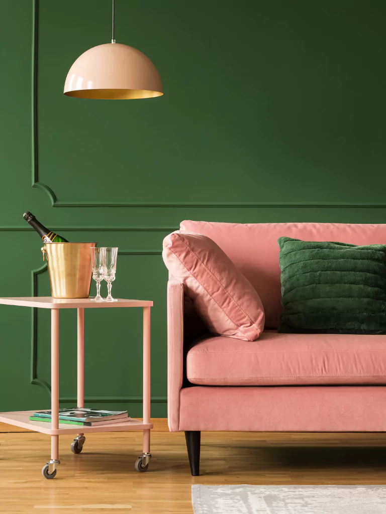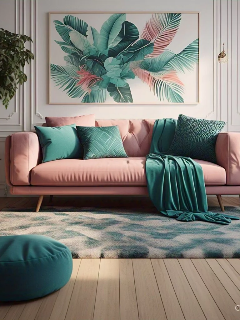 Combine pink with teal to create a dynamic and lively living room. Use pink for walls or large furniture pieces, and introduce teal through cushions, artwork, or decorative accessories.