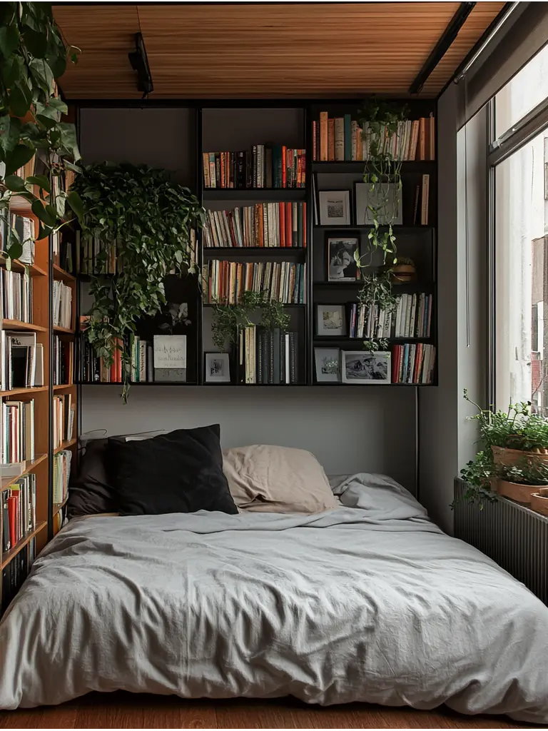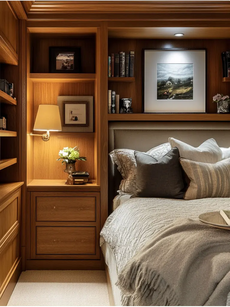 Custom built-ins can transform your small bedroom into a highly functional and stylish space. By adding built in shelves, you can maximize vertical space while showcasing decor or books.