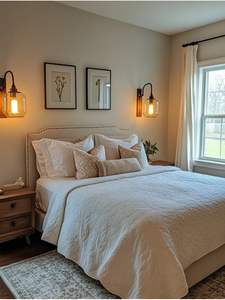 By using smart bulbs, you can easily adjust brightness and color to create the perfect ambiance for relaxing or working. Combine these with ambient lighting, like wall sconces or LED strips, to enhance the atmosphere and make your bedroom feel larger and more inviting.