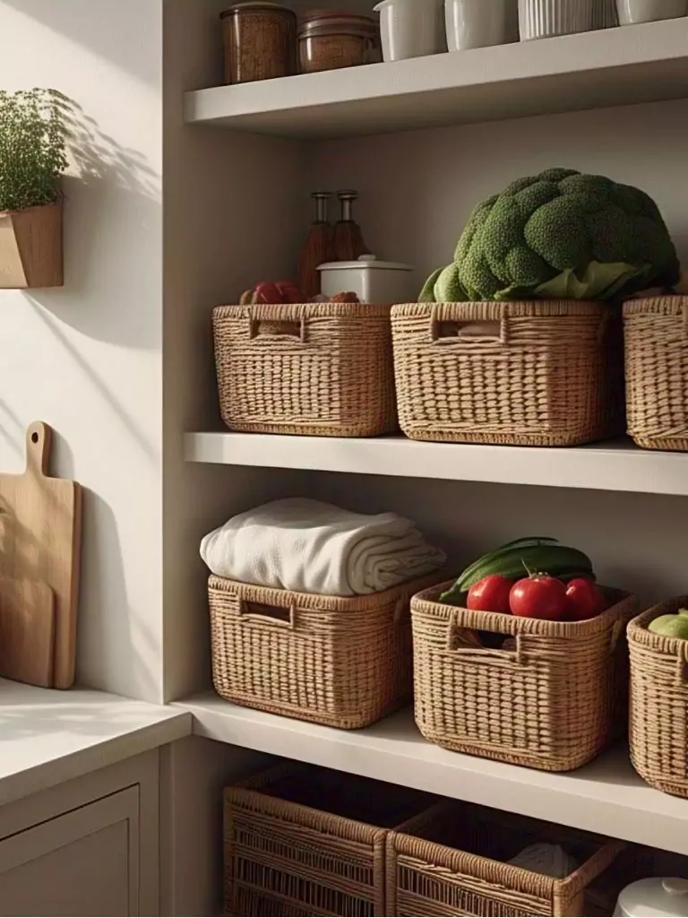 Woven baskets are a versatile organiser cucina solution for small kitchen decor, perfect for hiding clutter while adding warmth. Place baskets under open shelves, on top of cabinets, or in corners to store bulky items like onions, linens, or small appliances. This kitchen on a budget idea enhances your cozy kitchen with natural texture and keeps your small apartment kitchen tidy.