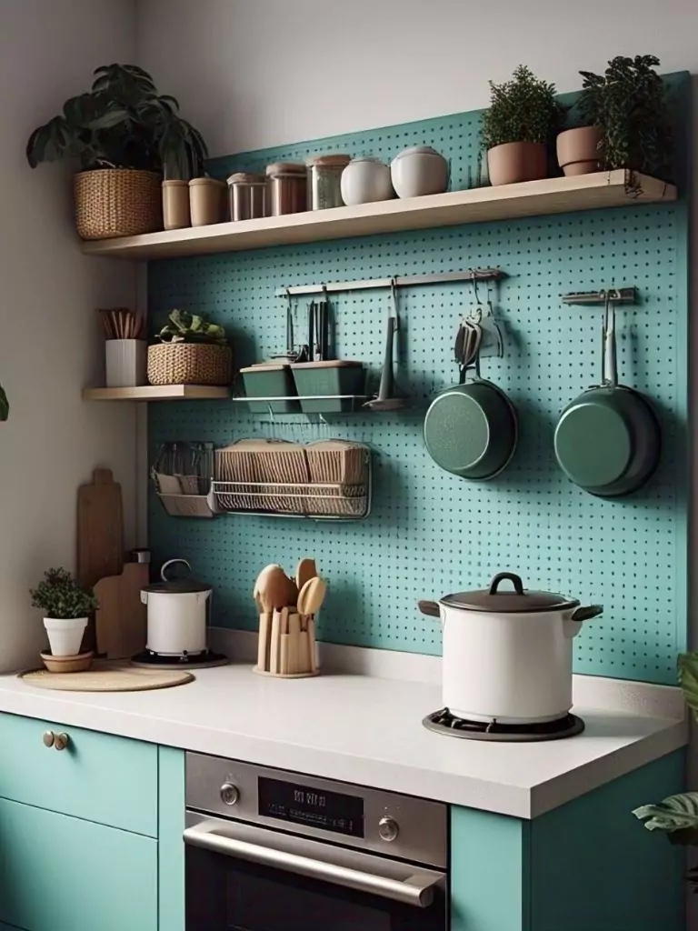 A pegboard is the ultimate organiser cucina for a tiny kitchen, offering endless customization for storage and style. Paint a large pegboard in a vibrant color or keep it neutral, then mount it on a wall to hang pots, utensils, or even small shelves for spices and mugs.