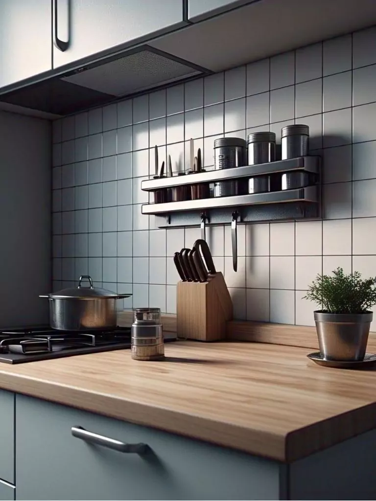 Magnetic strips are inexpensive and easy to install, available at most home goods stores. For added flair, arrange your tools in a visually pleasing order or pair the strip with other metallic accents like hooks or shelves. This small kitchen idea on a budget ensures your tiny kitchen is both functional and stylish, making it a standout in your dream apartment decor.