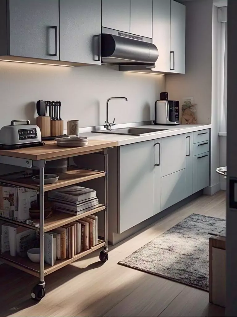 In a tiny kitchen, every piece of furniture needs to work double duty. A foldable table, rolling cart, or a narrow island can serve as a prep station, dining area, or extra storage, making it a must-have for small apartment kitchens. Look for pieces with built-in shelves or drawers to store appliances or linens, keeping your small kitchen decor streamlined and clutter-free. This kitchen on a budget idea ensures your space is versatile without sacrificing style.