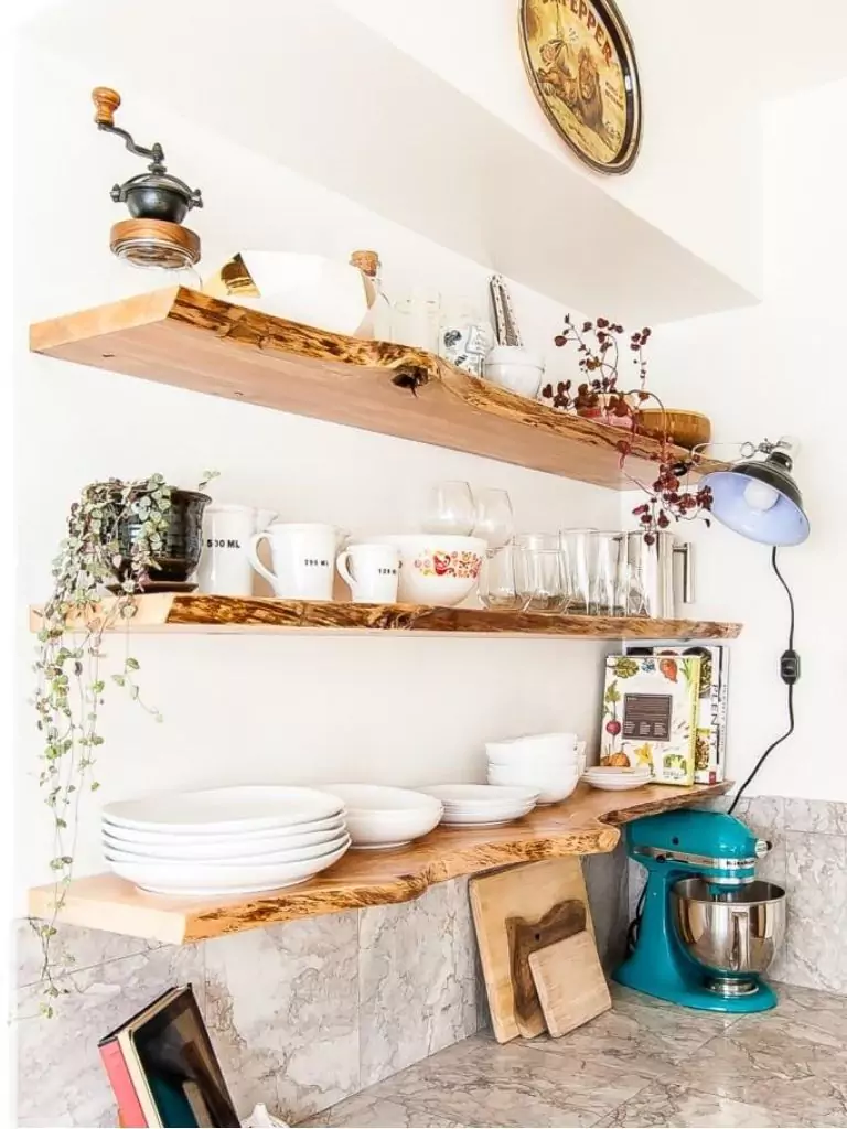 Ditch heavy cabinets and install open shelving to give your small kitchen decor an open, airy vibe. Wooden or metal shelves not only provide storage for dishes, cookbooks, and decorative jars but also let you showcase your personality with curated displays like colorful ceramics or small plants.