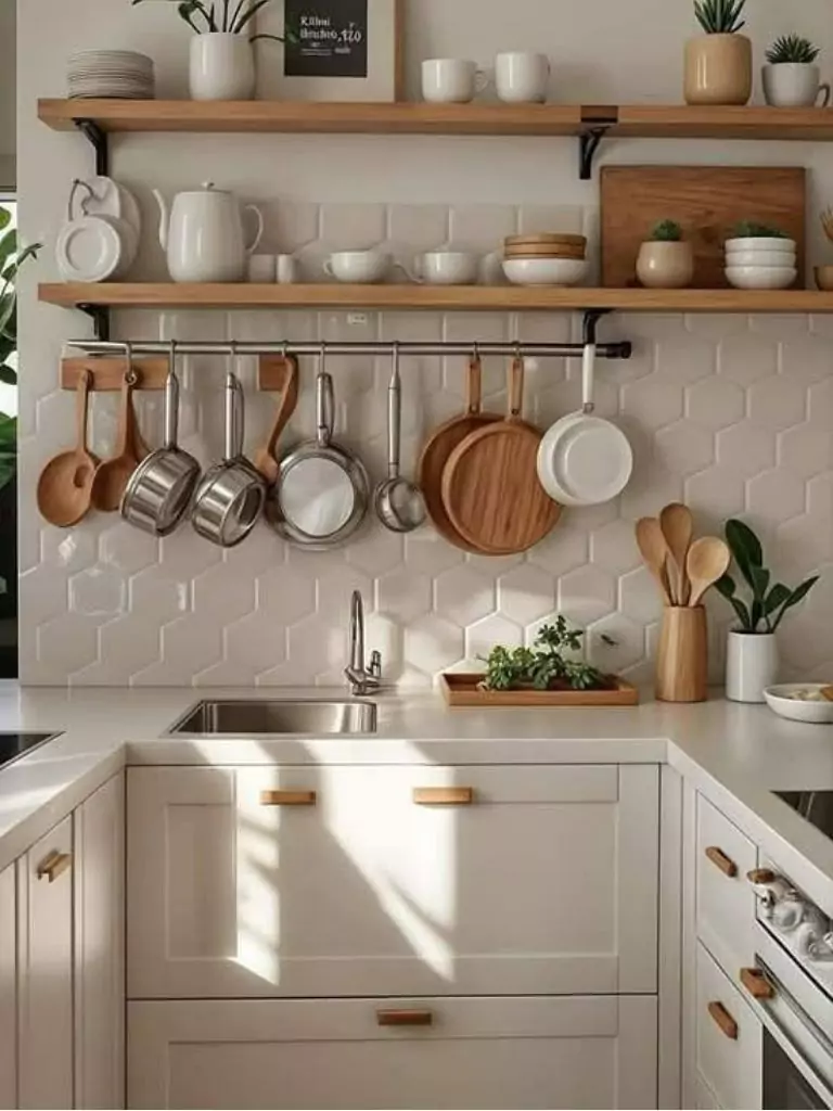 Hooks are a small kitchen idea on a budget that packs a big punch for organization and style. Install a row of sturdy hooks under shelves, along a backsplash, or on a blank wall to hang mugs, pans, or even small baskets for produce.