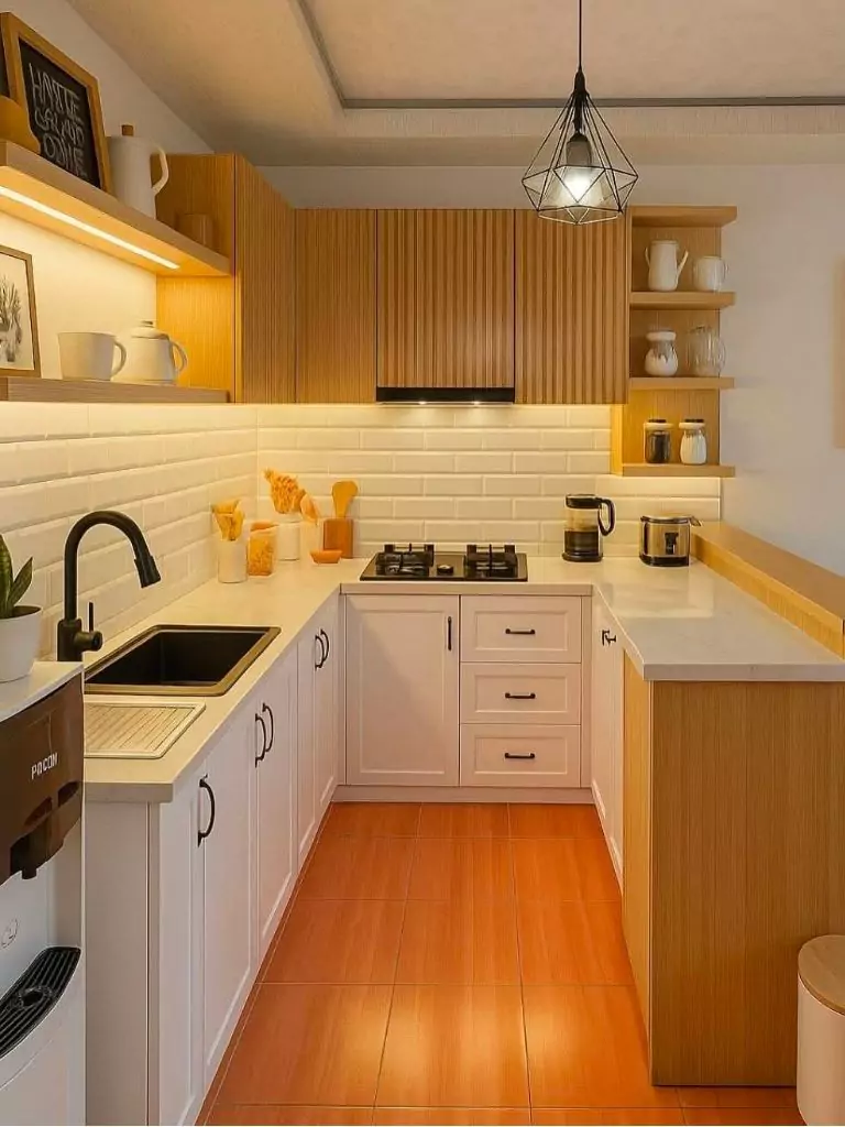 Under-cabinet lighting is a small kitchen idea on a budget that adds both ambiance and practicality to your small kitchen decor. Install affordable LED strip lights or puck lights under cabinets to illuminate countertops, making food prep easier and creating a cozy kitchen glow. This kitchen on a budget solution enhances your small apartment kitchen’s functionality and style.