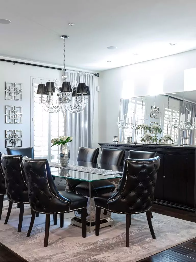 For a luxurious and dramatic look, go for a glossy black glass dining table. The reflective surface adds glamour and is often seen in upscale or urban homes.