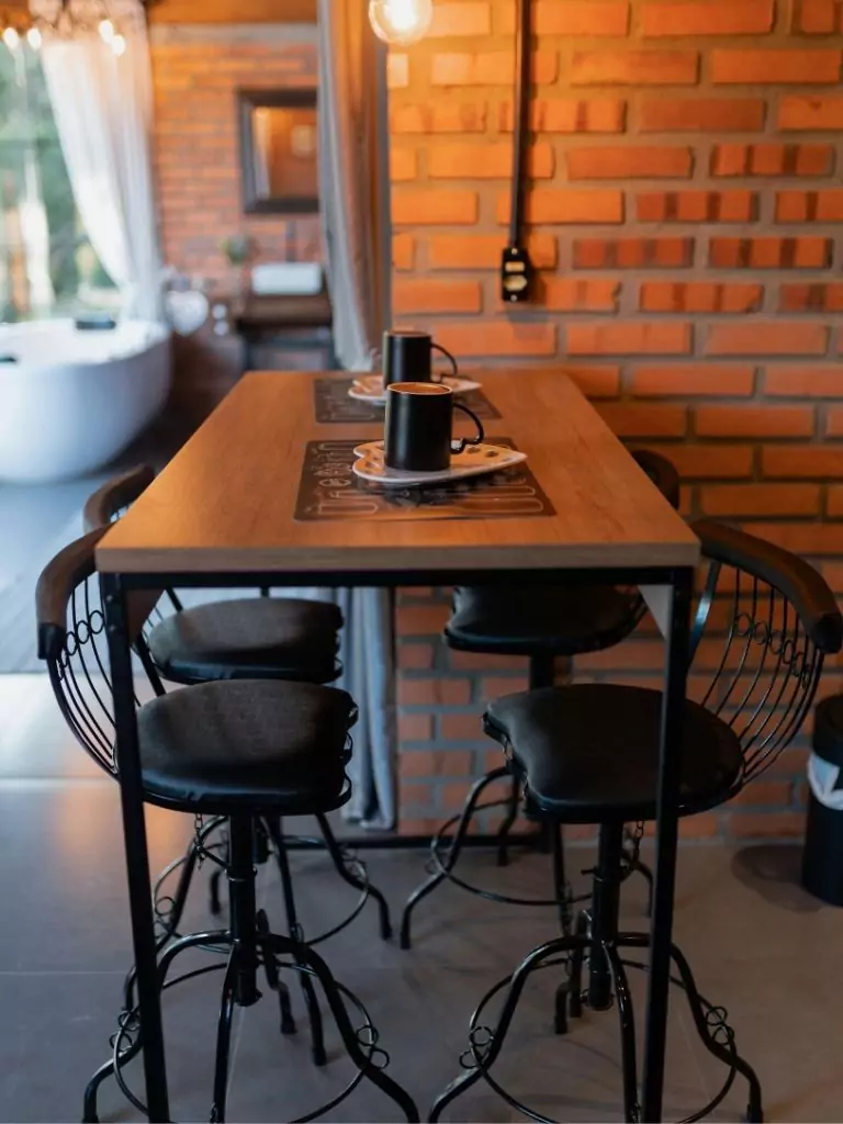 Decorate minimally to keep the surface usable—maybe a small plant or stack of coasters. Choose chairs that tuck in easily to save space.