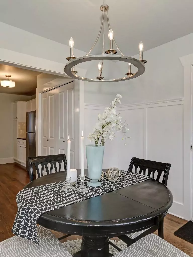 Round black tables are a space-saving solution that adds charm to small kitchens or dining nooks. They promote conversation and work well with curved or padded chairs.