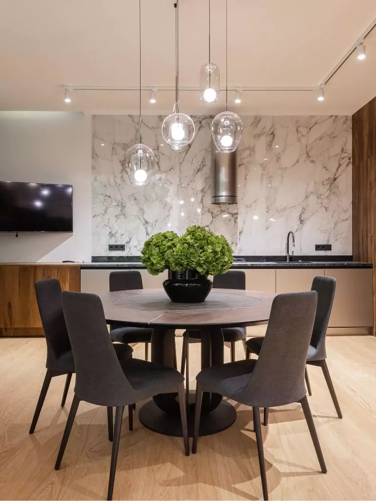 Style it with monochrome or geometric dinnerware, and hang a statement pendant light above. This setup is ideal for apartments or open-plan living spaces where modern design reigns.