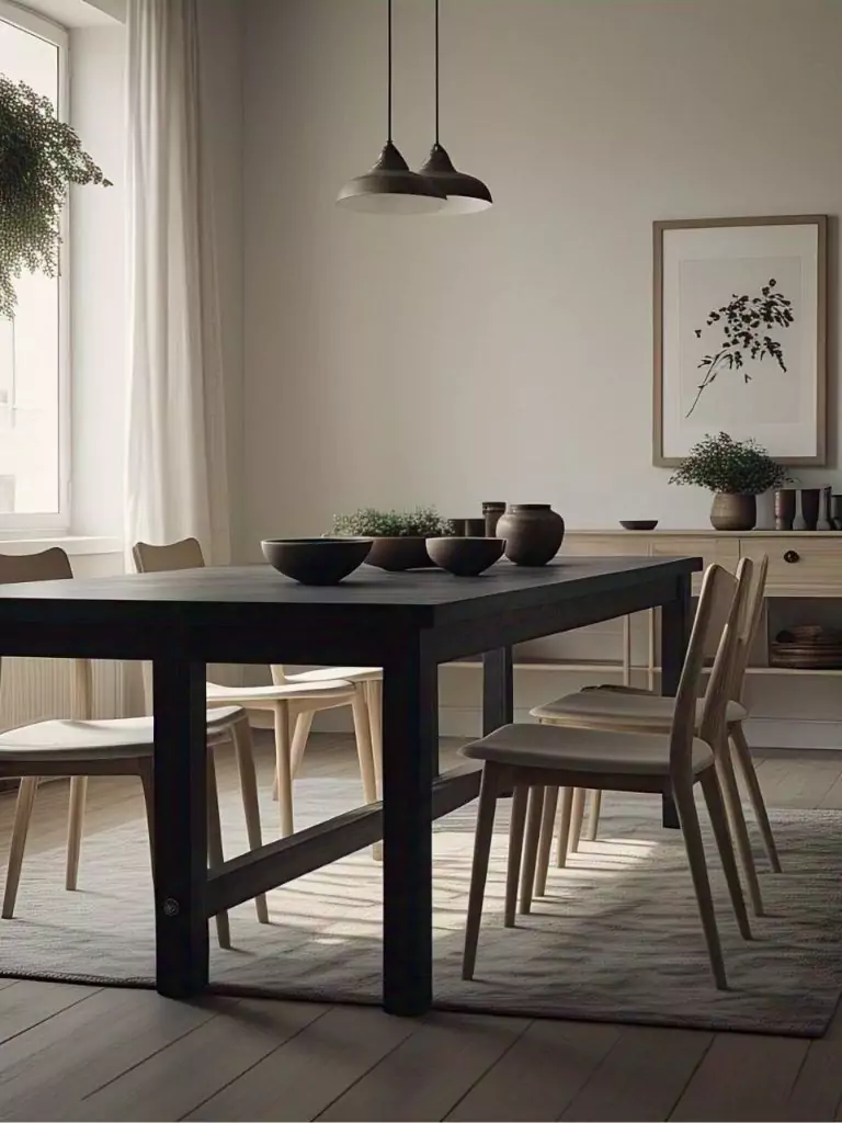 Scandinavian design meets black in a simple, clean-lined dining table often paired with light wood or neutral-toned chairs. It’s functional, beautiful, and calming.