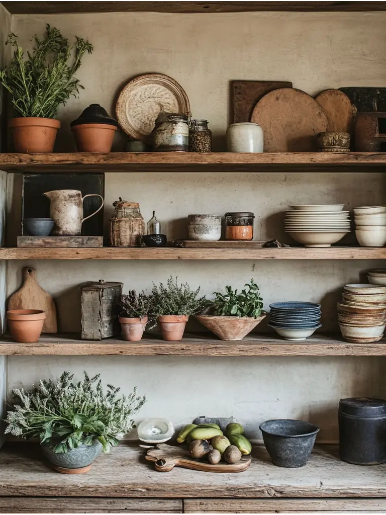 These unique shelves add character and warmth to any room, showcasing your favorite decor items or plants. With their rustic appeal, reclaimed wood shelving not only provides functionality but also enhances your vintage farmhouse style, making your space feel inviting and lived-in.