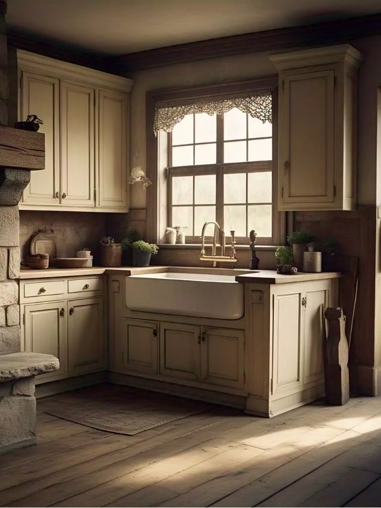 Complement this look with wrought iron lighting fixtures, ceramic jugs, or vintage lanterns to make the space feel even more authentic. You can also add wooden open shelves or an old chimney-style hood to enhance the cottage-like ambiance. This setting works beautifully in both larger kitchens and compact spaces looking to add character.
