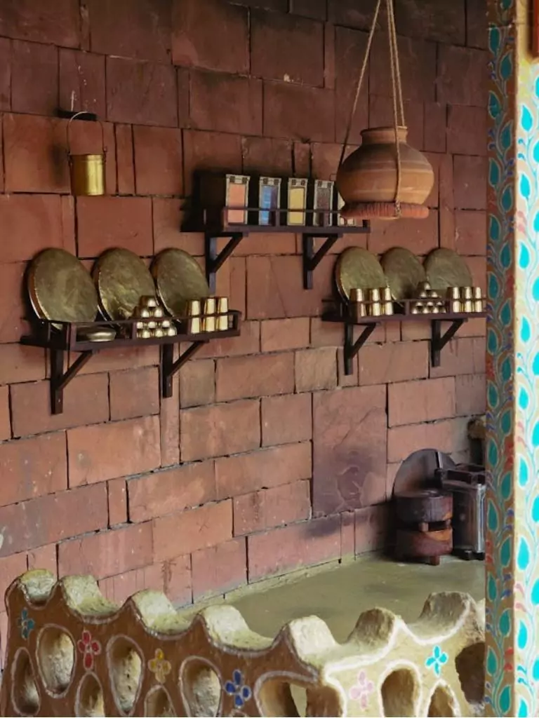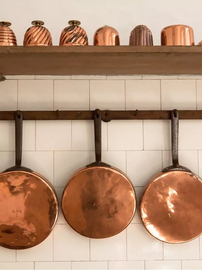 Over time, copper gains a beautiful patina that enhances its antique charm. You can also mix in wrought iron or brass utensils to balance the metallic elements. The key is to make it look curated—not cluttered—so every piece feels intentional.