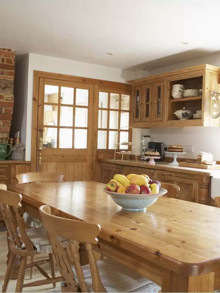 Instead of installing a modern kitchen island, consider repurposing a large wooden farmhouse table. This adds a rustic, authentic look while providing an extra work surface and gathering spot. The aged wood adds warmth, texture, and personality.