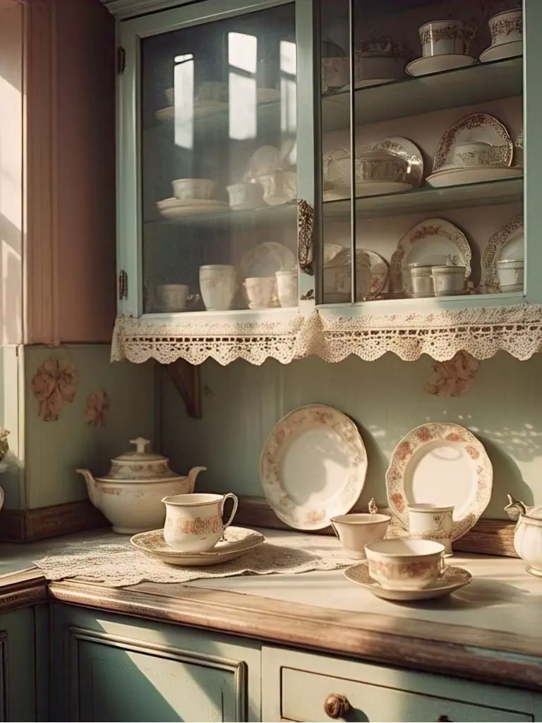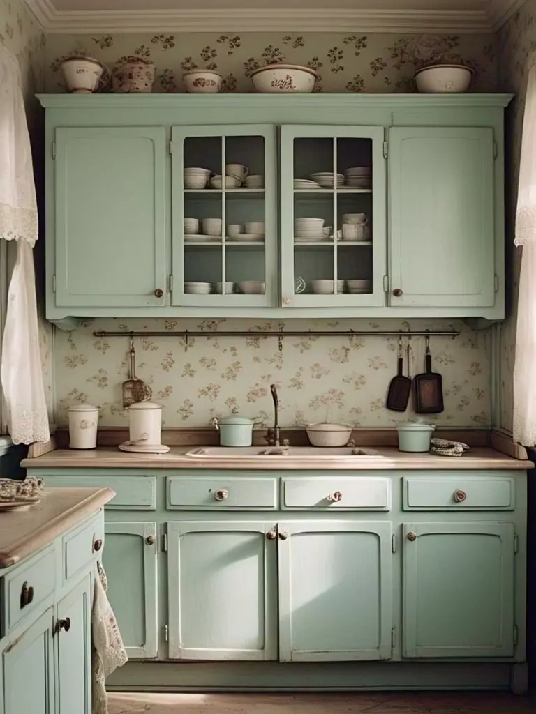 Glass-front cabinets allow you to add depth and personality to your kitchen by showcasing your dishware collection. Add lace or embroidered linen liners inside for a delicate and truly vintage touch. This small detail adds softness and reflects the feminine grace of vintage home renovation styles.