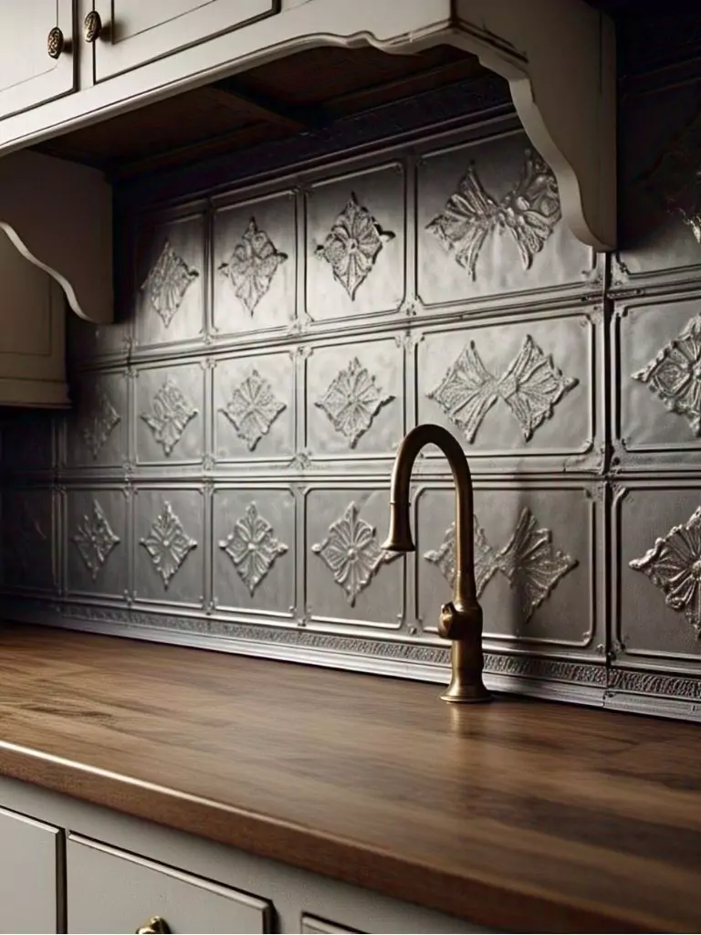 It’s also heat- and stain-resistant, making it a smart choice behind the stove or sink. Paired with vintage cabinetry and brass accents, pressed tin brings craftsmanship and charm into your kitchen’s core.