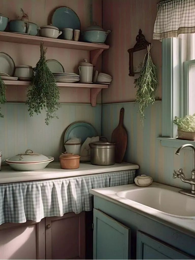 Pastel hues like mint green, pale lavender, soft peach, or buttercream yellow help to soften the room and infuse it with light. These hues work beautifully on cabinetry, kitchen islands, or even vintage-style appliances. Add dainty ceramic vases, embroidered curtains, and lace-edged linens for a truly cozy and inviting vibe.